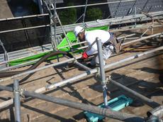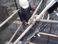 単管パイプに安全帯を掛けながら屋根材切断、留め付け…と作業分担しながら効率良く作業を進めます。