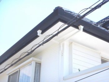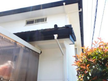 白色の板金を巻き、黒色の軒樋を掛けました。『サーフェスケア』と合わせた縦樋は『瞬水』仕様。40ミリ角型ですが、しっかり働く優れものです。